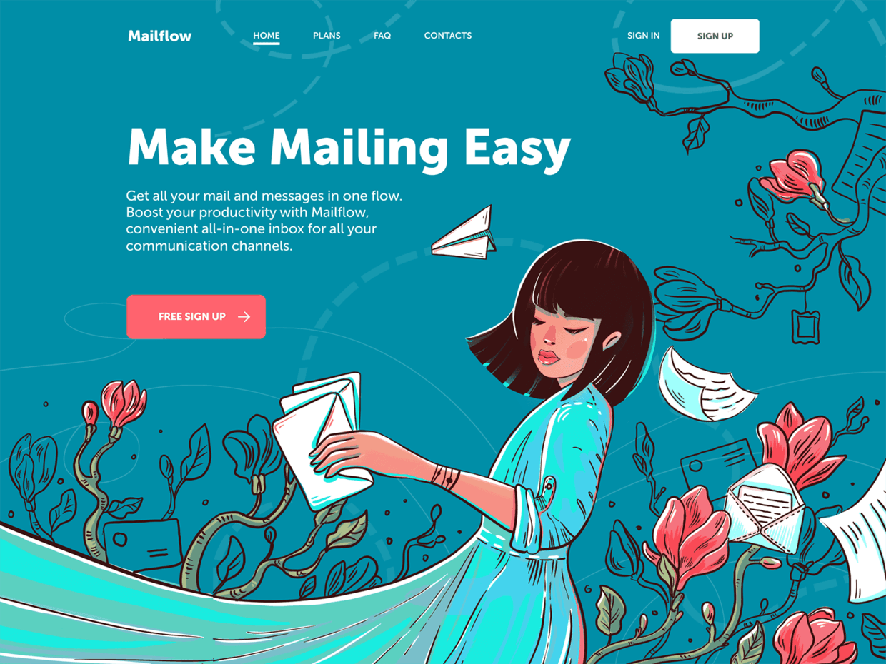 该页面的指示性设计元素实在很巧妙,不易发觉,却又能把全部的注意力都集中到一点上——FREE SIGN UP。如果你仔细观察,每个元素,无论是纸飞机的朝向,还是花朵延伸的方向,全部都指向了CTA。