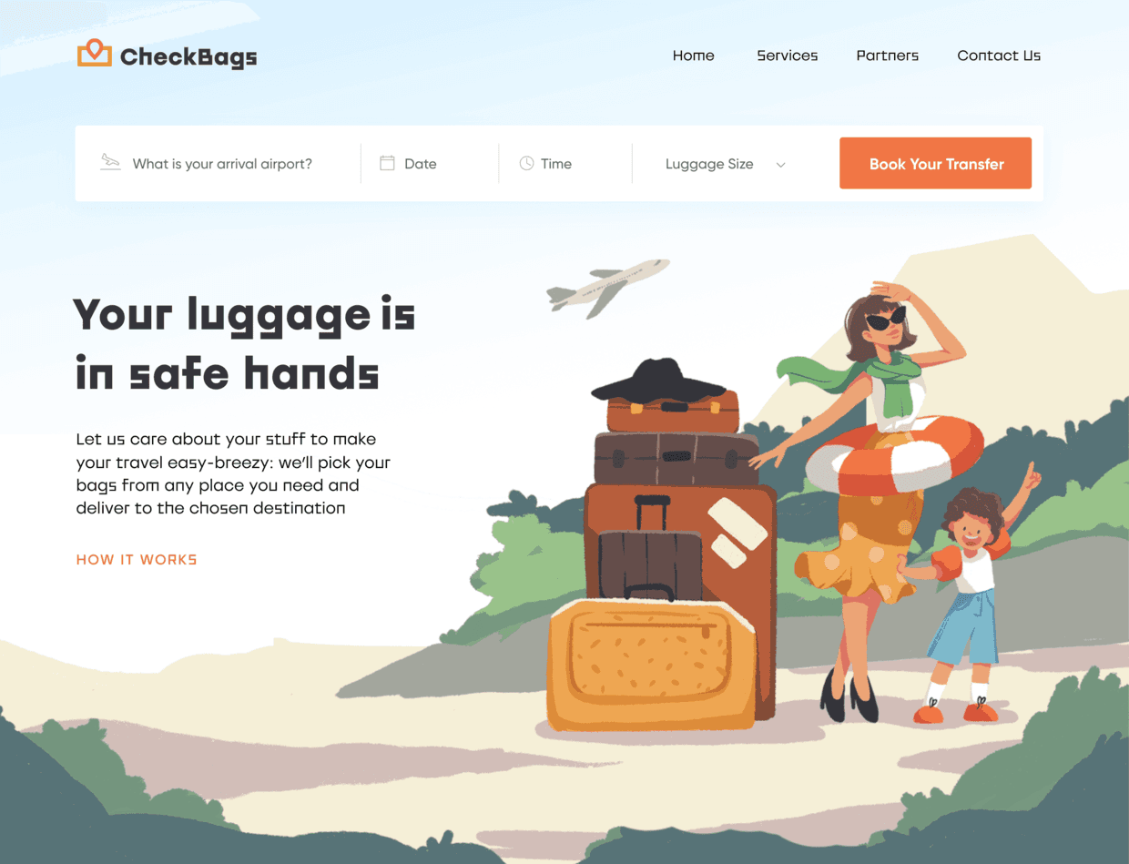 使用了插图,人物和飞机都指向了顶部最右侧的CTA,也就是BOOK YOUR TRANSFER这个按钮。