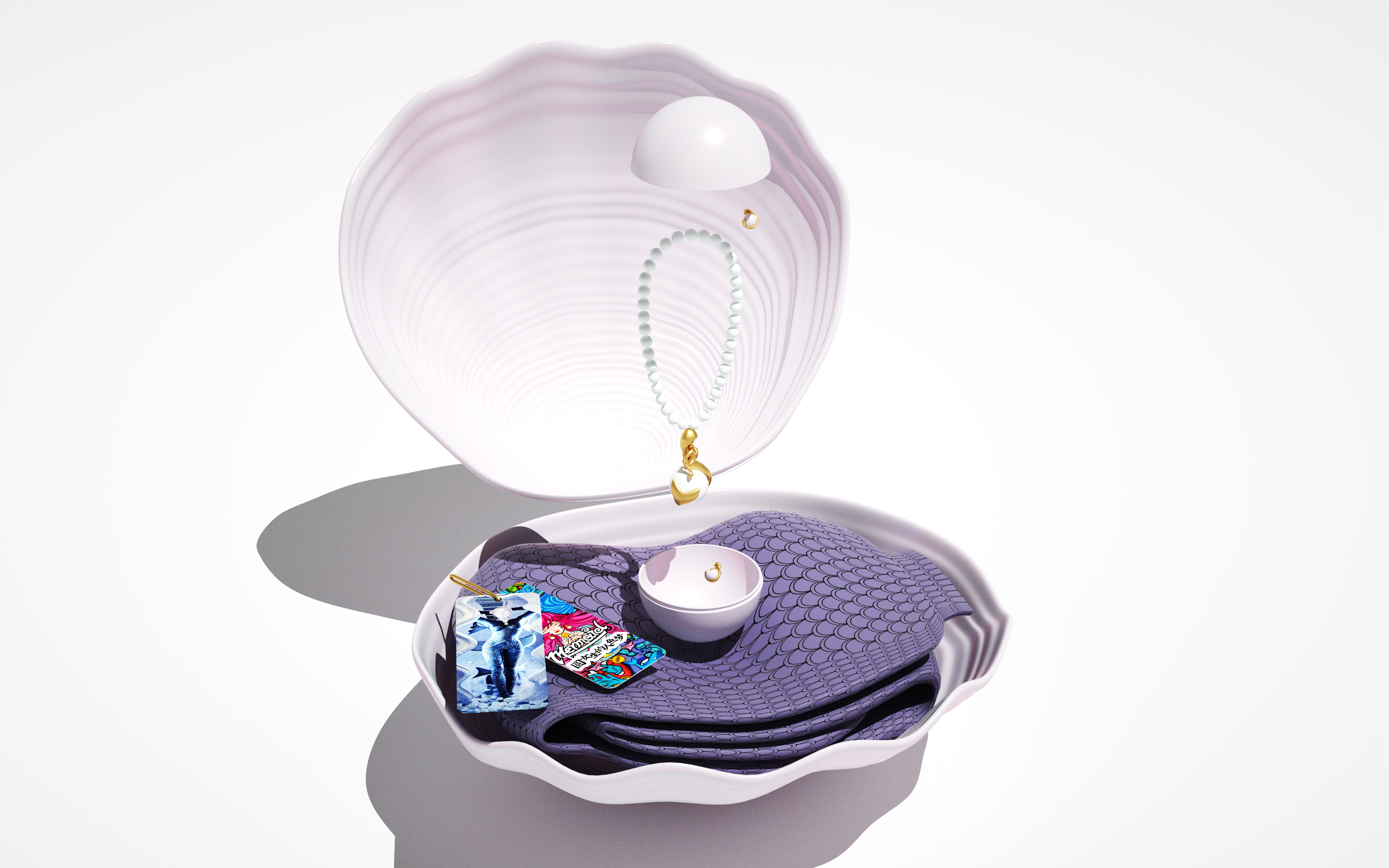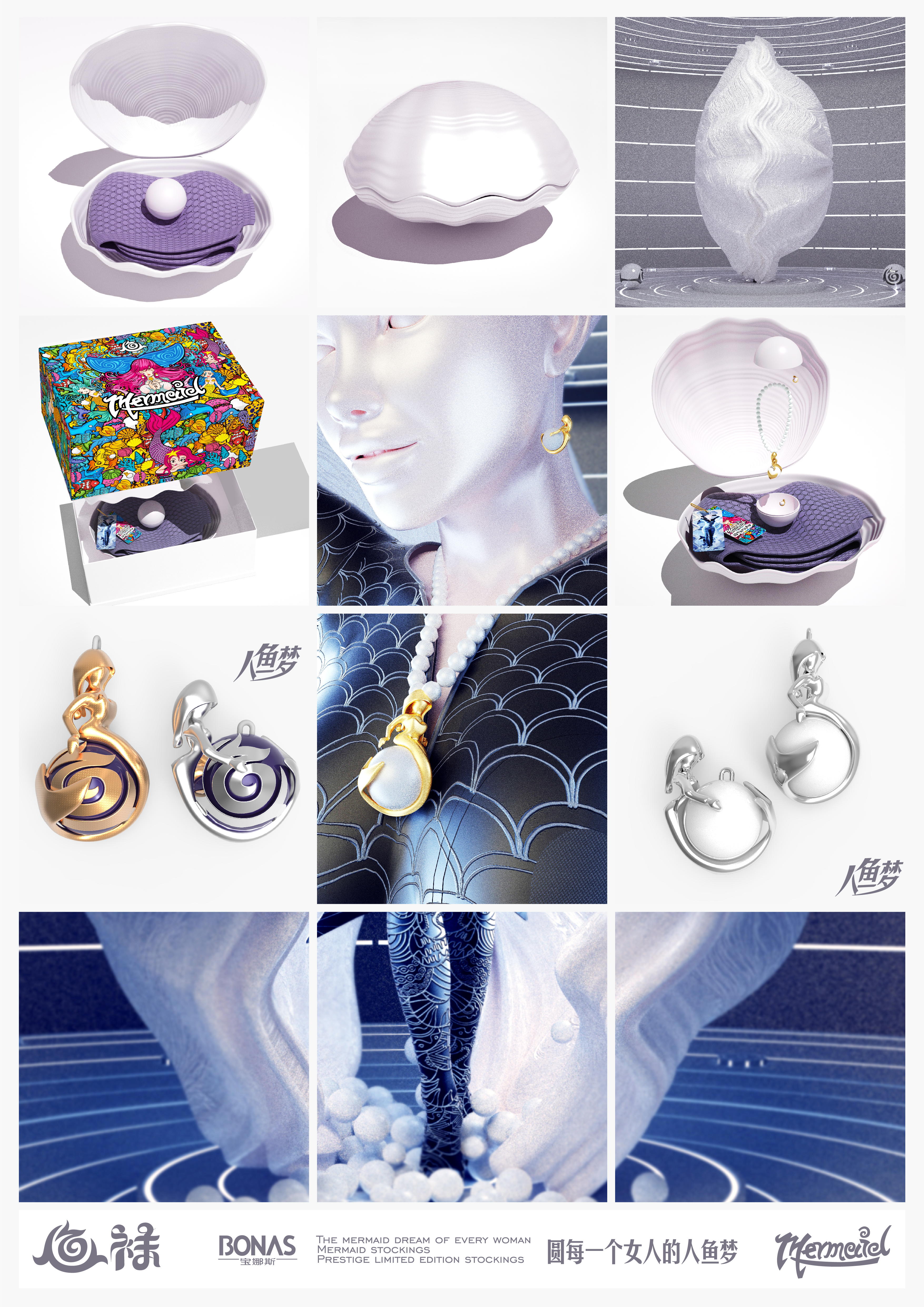 创意说明:丝袜的款式是按照人鱼的特征去设计的,整体风格遵循美人鱼的传说、神秘、妖艳塑造袜子、套装、副属品(首饰)来设计,易于营销炒作,大贝壳(首饰)来设计,易于传播,大贝壳(砗磲)可以放大商场吸引人群,模特在砗磲中间展示,配合后期营销。