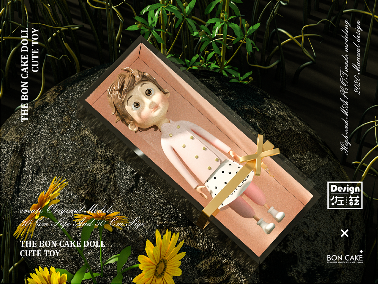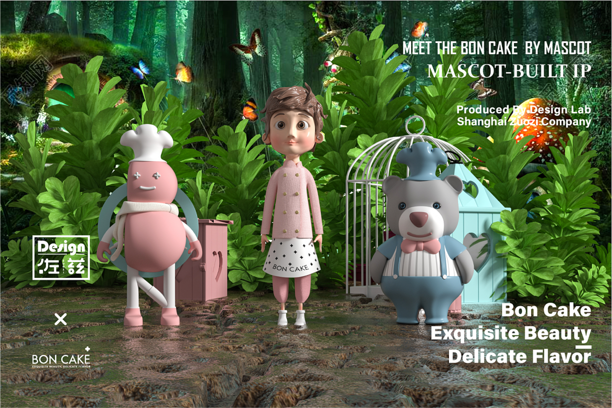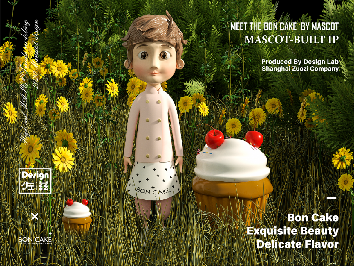 小BON(遇见BON):以欧美青年帅气形象为基础,结合拟人化的儿童可爱倜皮形象,扮演蛋糕师傅的角色。上身穿着浅粉色厨衣,下身搭配小围裙,印有BON CAKE的LOGO。手办设计要在衣服上展示品牌标志,并将品牌名称打出来。这个吉祥物可以命名为"小BON"或者"小男孩",通过发型和帅气的脸型展现出美少年的特点。