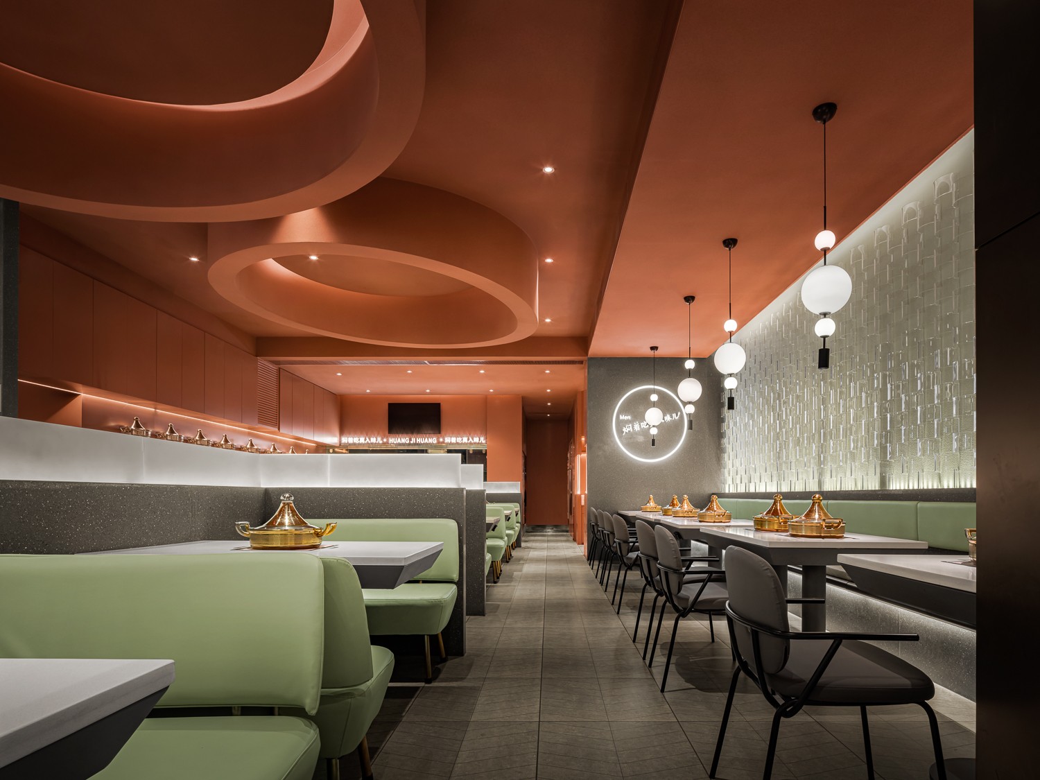 本案黄记煌西安店,设计师以古城的布局整理演化,结合城墙的拱形元素,在入口打造一处“城门”打卡造型,两道拱门交错叠加,彼此呼应。顾客走过二道拱门,步入城内,进入这座黄记煌味蕾之城。餐饮设计