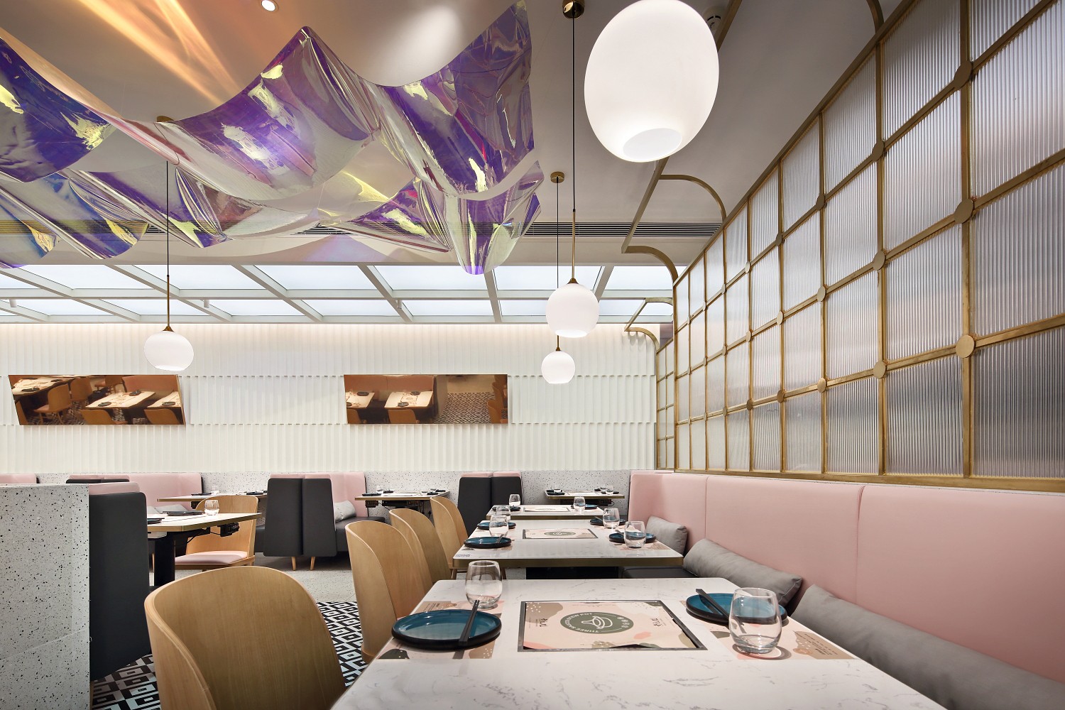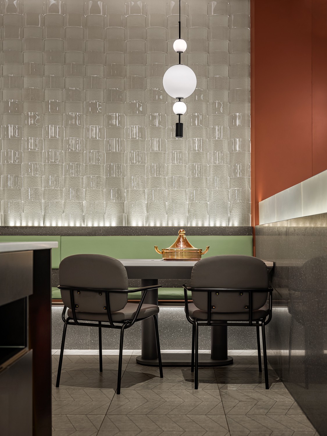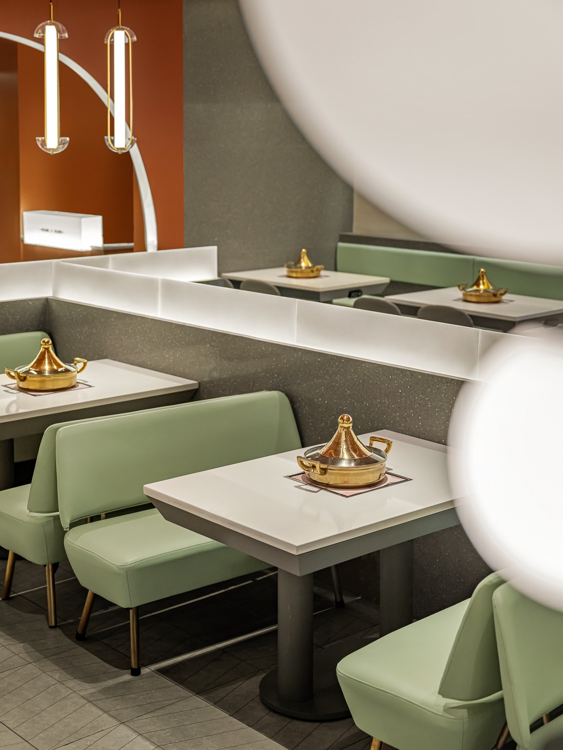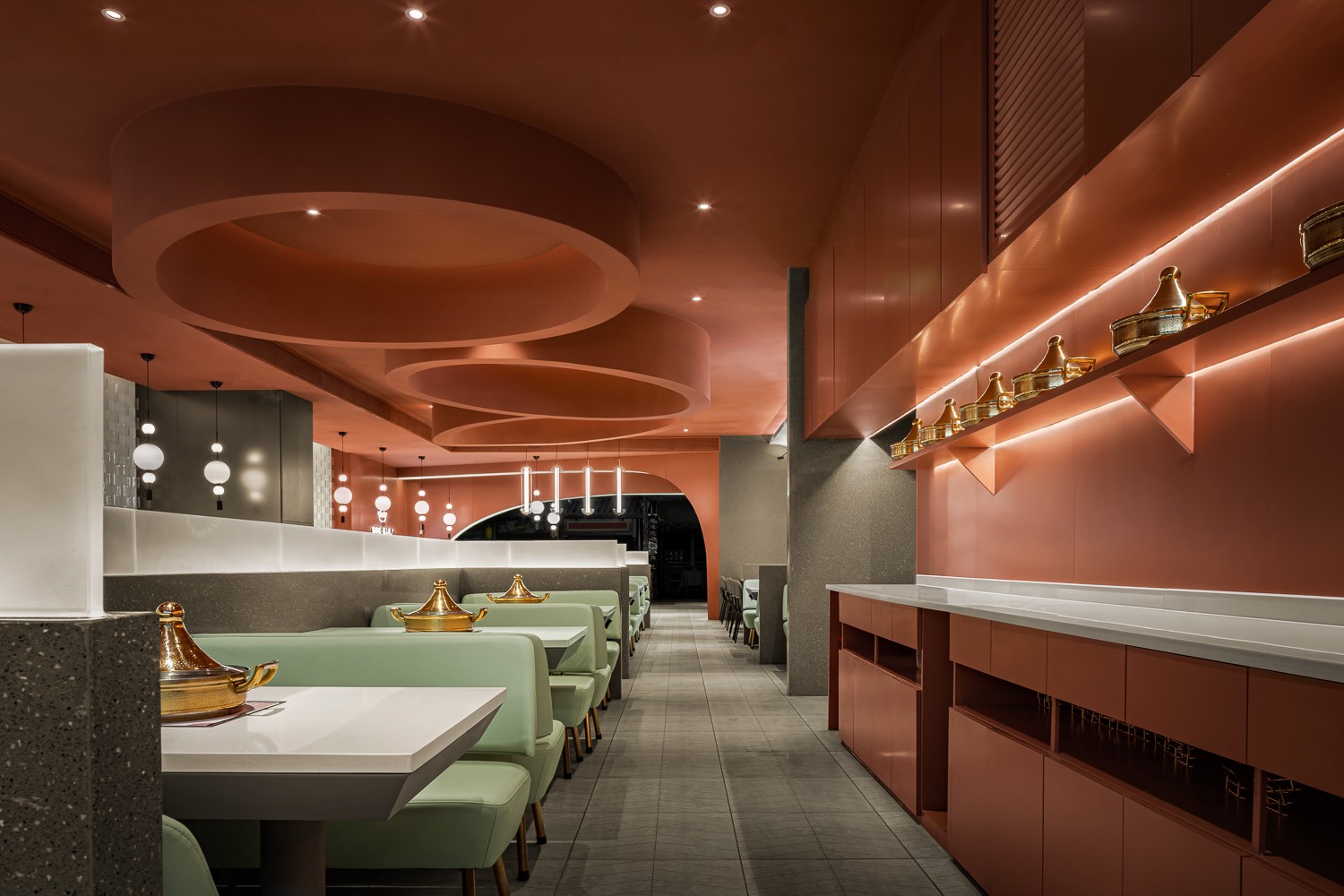 空间设计灵感取意古代建筑。大面积的茶色搭配练色,以铜绿为点缀,视觉上十分简约。茶色天井营造出宫殿用餐氛围,墙面造型是传统屋檐的抽象赋形,呼应门头的拱弧设计。