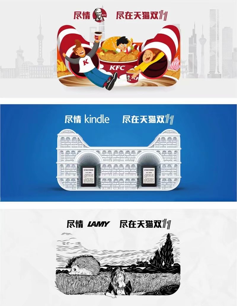 还是拿天猫的猫头举例,这就是一个延展性很强的符号,因为他的造型够简单,而且底边是水平的,接近于一个矩形,所以这个视觉符号几乎贯穿了天猫的所有品牌宣传。