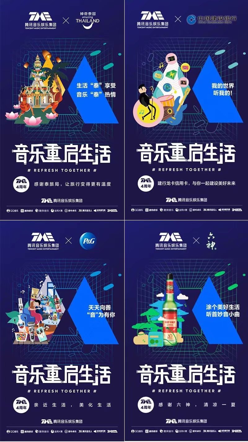 腾讯音乐娱乐集团等系列海报都是以Logo中的M作为视觉符号,这个M就是两个斜色块,非常简单。