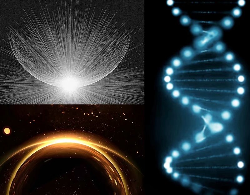 接下来是背景的优化,纯色的背景不透气,与分子结构图不搭,我们可以把画面中心作为发光区域,再去网上找一些发光素材以及DNA素材。