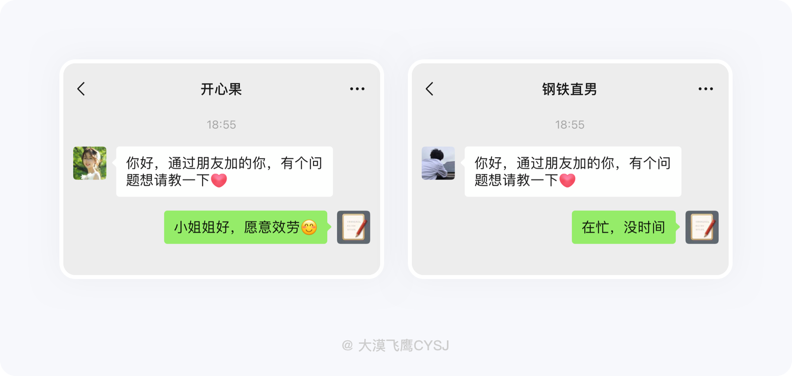 如果是一个单身男性,当社交应用中有人加好友或请教问题时,针对有美女头像的用户,其响应效率、质量都会比其他头像的用户要高,这是不争的事实(别杠,我们不谈个例),这也说明自己时刻都在注意在对方心中的形象,总担心被对方看“穿”。
