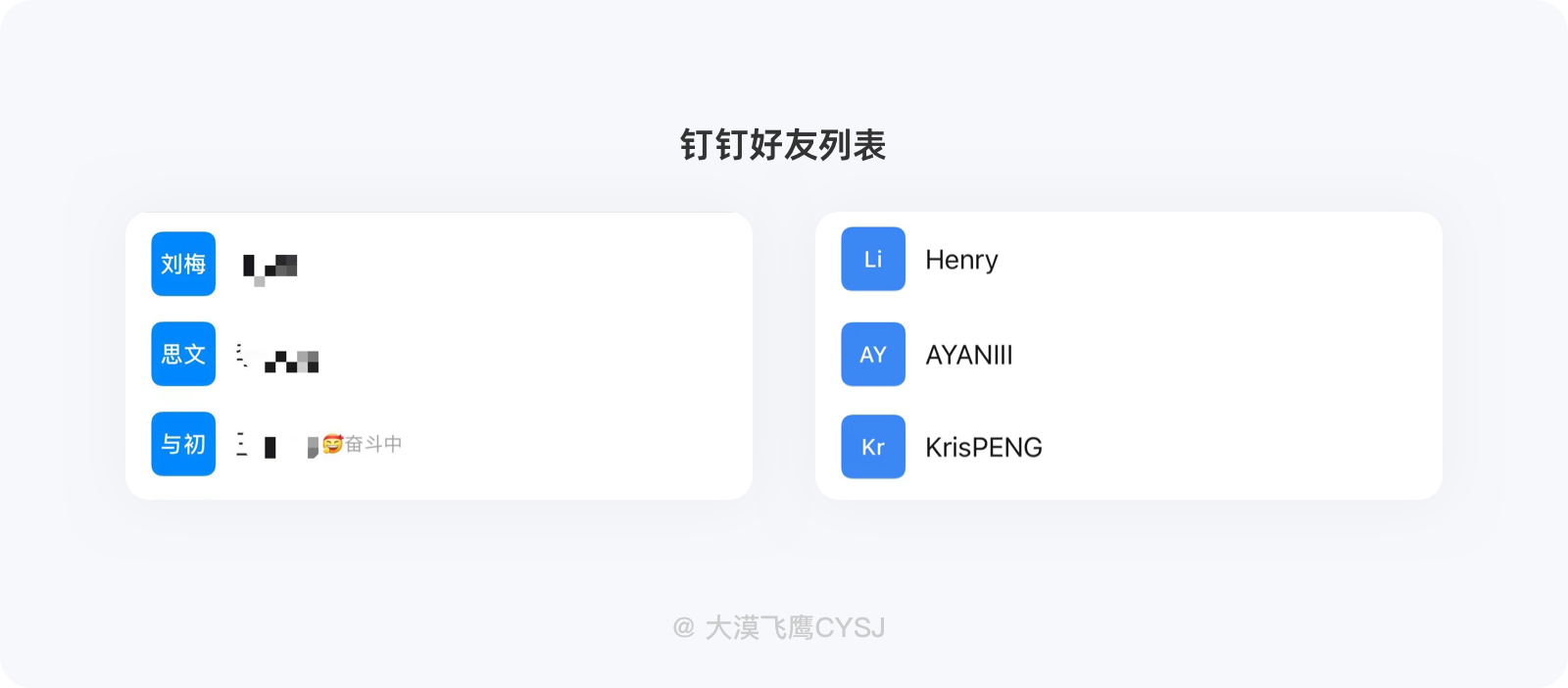 常出现在移动办公类应用中,由系统自动处理,基于OA类应用社交属性并不强,大多用于内部团队工作中的沟通交流,例如钉钉、纷享销客、飞书等。为了更清晰的获取对方个人信息,这类产品头像更倾向于上传自己的真实照片(部分企业强制),在用户未上传照片的情况下,系统会提取中文名字中的后两个字(两个字的全名显示)、英文名字前两个字母作为个人头像使用,方便团队成员更好的辨认。