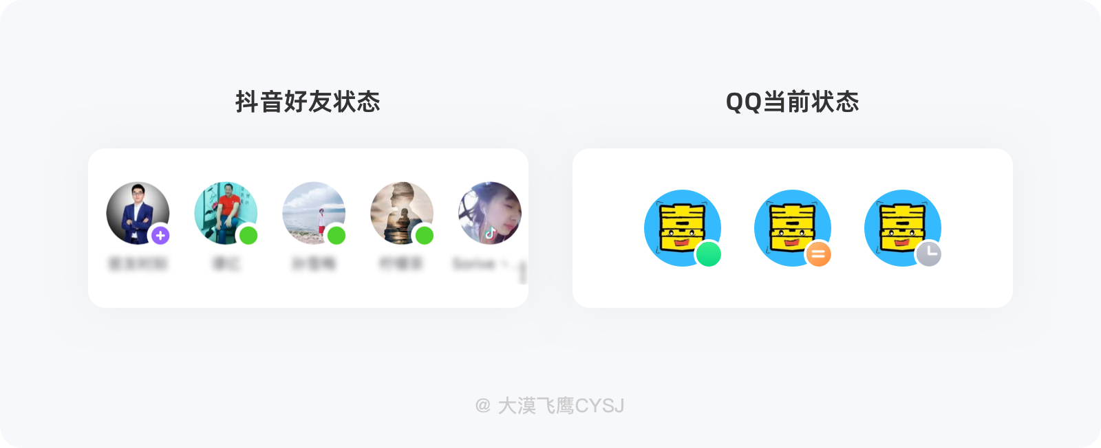 用彩色头像和黑白头像来区分用户是否在线是最直观的表现方式,例如打开QQ好友列表,对方当前是否在线一目了然。除此之外,QQ的在线状态还延展了多种子级状态,例如:离开、忙碌、听歌中、请勿打扰...等,设置成功后,会以小图标的样式重叠在头像右下角,好友看到后能清晰感知当前状态下是否可以立即联系你。抖音采用了较为简单的方式,头像右下角有绿色小圆点显示表示在线,没有则代表离线。